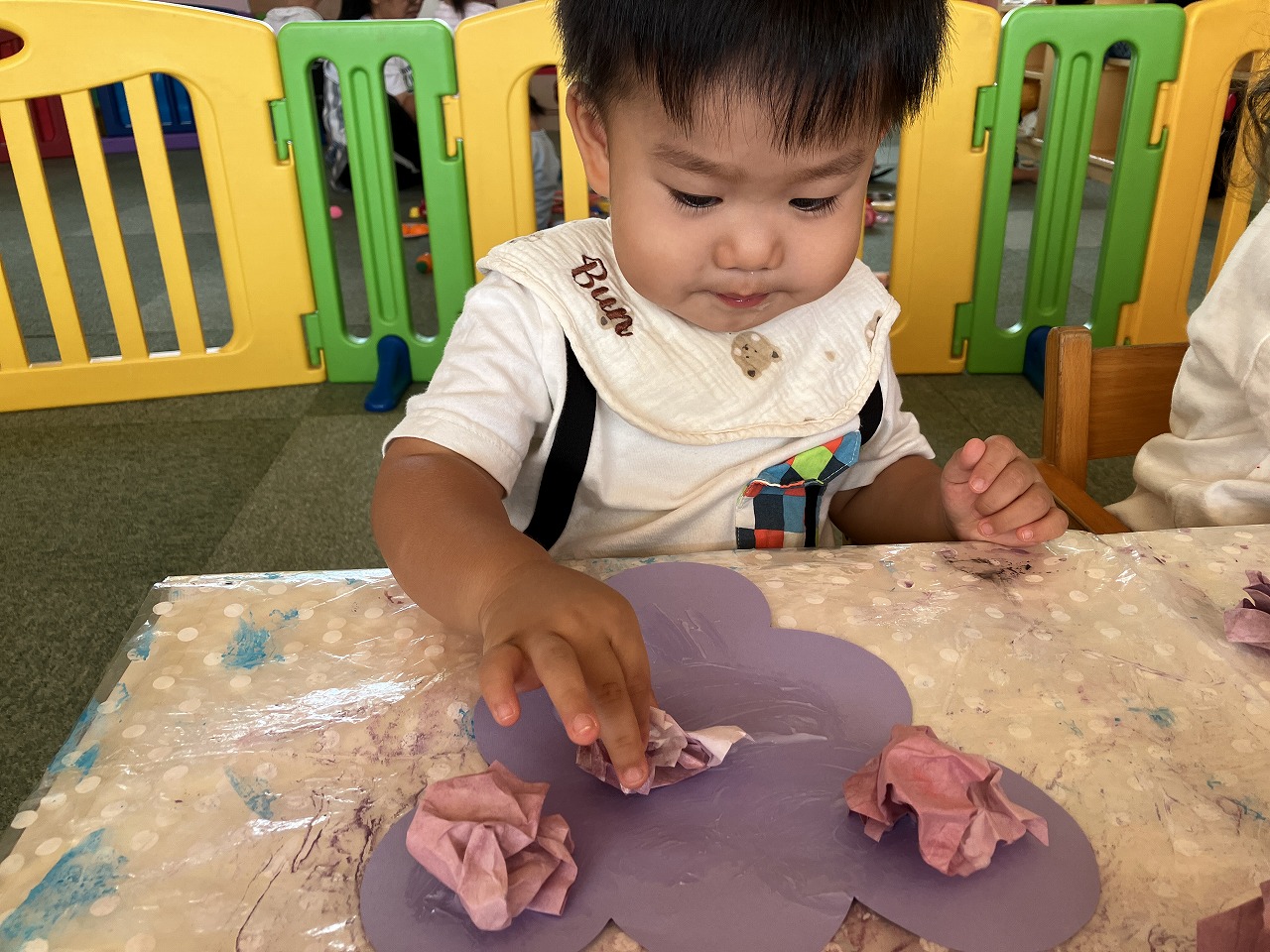 色水氷で和紙を染めて、ブドウを作りました。少し固い和紙を丸めながらおいしそうなブドウを作ることができました。初めてのりを使ったので、子どもたちも興味津々でした。のりが手につくと「え?なにこれ」と戸惑う姿も見られましたが、「ブドウを上に置いてぎゅっと押さえてみてね」と声を掛けると頑張って取り組んでいました。画用紙にくっついたブドウをみて、どの子も嬉しそうにしていました!