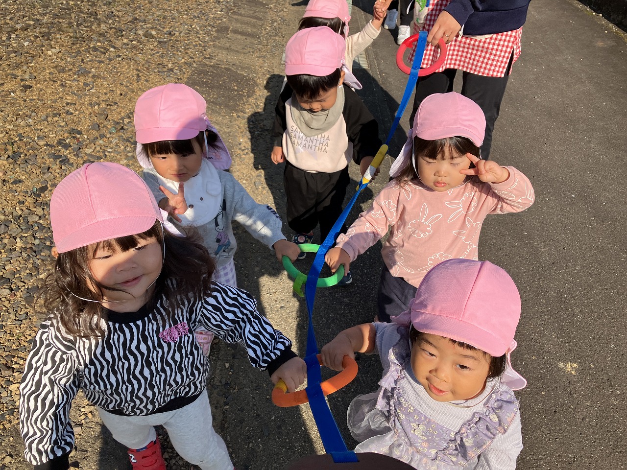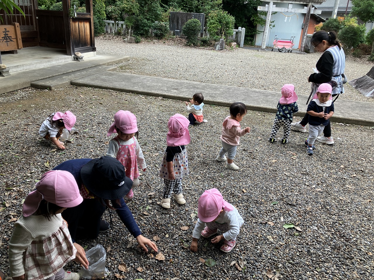 みんなで青柳神社まで行き、どんぐりを拾いに行きました。少し遠い道のりでしたが、歩いたりカートに乗ったりして散歩を楽しんでいました。今月に歌っている「どんぐりころころ」をうたいながら楽しく散歩が出来ました!どんぐりを見つけては一つずつ「あったよ!」と言いながら大切に袋に入れていました。長い距離が歩けるようになり、みんなとても嬉しそうにしていました!