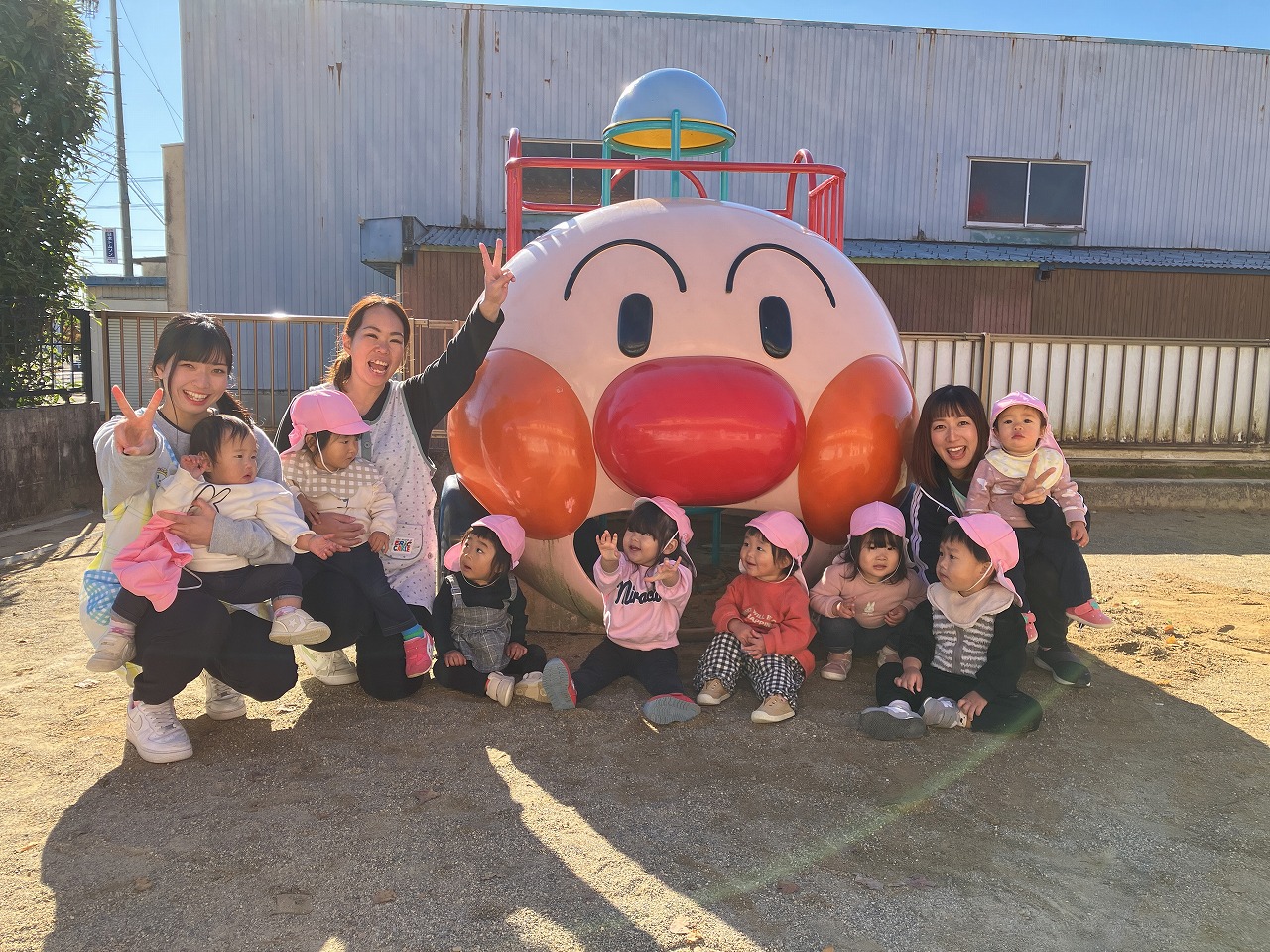 大好きなアンパンマン号とお別れをしました。上に登って遊ぶことはありませんでしたが、中に入りながらかくれんぼをしたり、「アンパンマンいるね」 などと遊ぶときに話をしたりして楽しんでいました。アンパンマンは正義のミカタ!いつもみんなのことを見守ってくれてありがとう!今度はどんな遊具で遊べるのか楽しみだね!