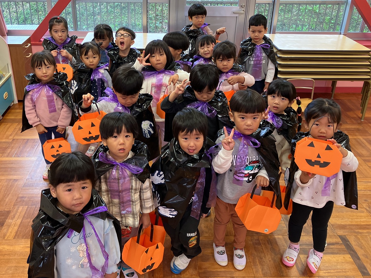 「もうすぐハロウィンだね。」と楽しみにしていた子ども達。ハロウィンに向けてマントとお化けかぼちゃの鞄を作りました。マントには自分の手形のお化けを貼って「お化けがいっぱいだね。」と嬉しそうにしていました。ハロウィン当日はマントを着て、鞄を持って「ハッピーハロウィン!」とにこにこ笑顔でした。お菓子をもらって楽しいハロウィンを過ごしました。