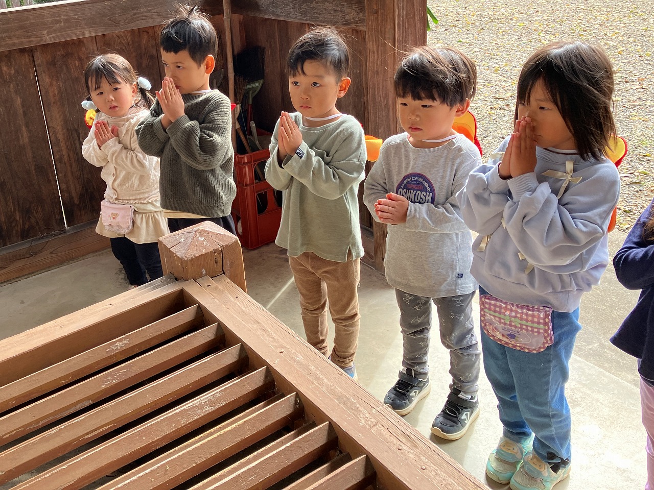 そら組さんに手をつないでもらい青柳神社まで出かけ、とっても嬉しそうにしていた子ども達。青柳神社では七五三のお参りをしました。お辞儀をしたり手をたたいたり手を合わせてお参りをしたり…目をつむってお参りする姿がとっても可愛かったです。お参りをした後はどんぐりや葉っぱを拾って楽しんでいました。お散歩が大好きな子ども達なのでまた出かけたいと思います♪