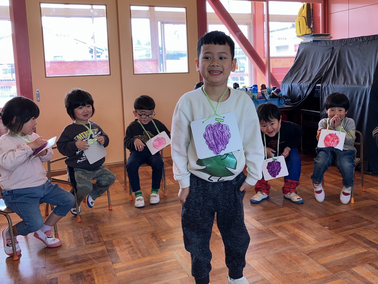 自分のフルーツを忘れないように自分で作ったフルーツの絵カードを首にかけてフルーツバスケットを楽しんでいます。最初はルールが分からず戸惑っていた子も繰り返し遊んでいくうちに素早く空いている椅子を探して座ることができるようになってきました。「いちご!」「ばなな!」と楽しくフルーツの名前を呼んでいるのですが「フルーツバスケット!」と言うのがとっても楽しい様子で「フルーツバスケット!」と言われるとみんな大はしゃぎです。そんな姿がとってもかわいい子ども達です。