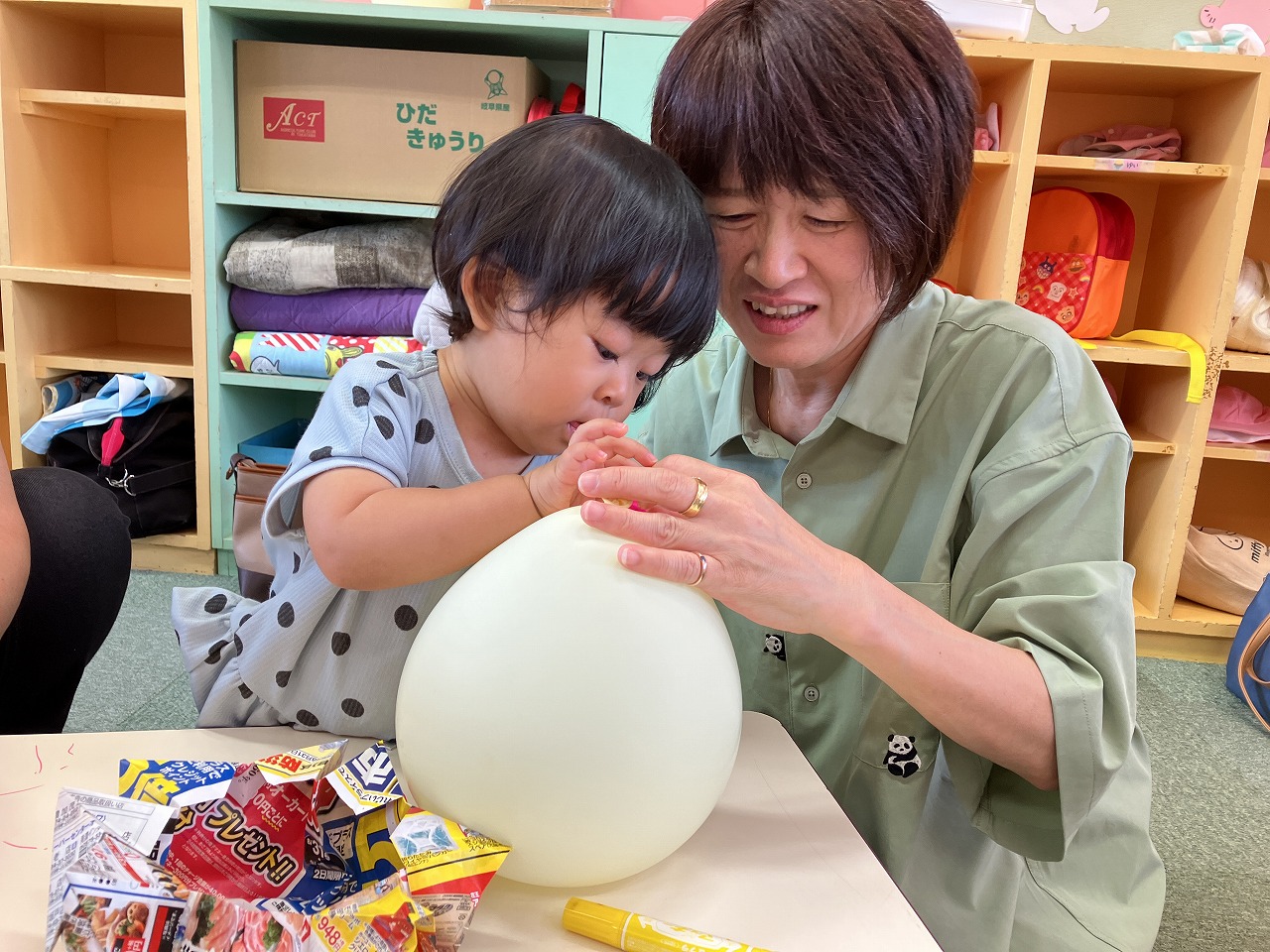 夏の暑い時期だからこその氷を使って遊びました。水の中に玩具を入れて固めることで手の熱で溶かしながら、一生懸命玩具を取り出そうとしていました。少しずつ溶けてくると「わぁ!」と喜びの歓声があがりました。氷の冷たさや水の気持ちよさに触れながら、みん奈で楽しく遊びました!