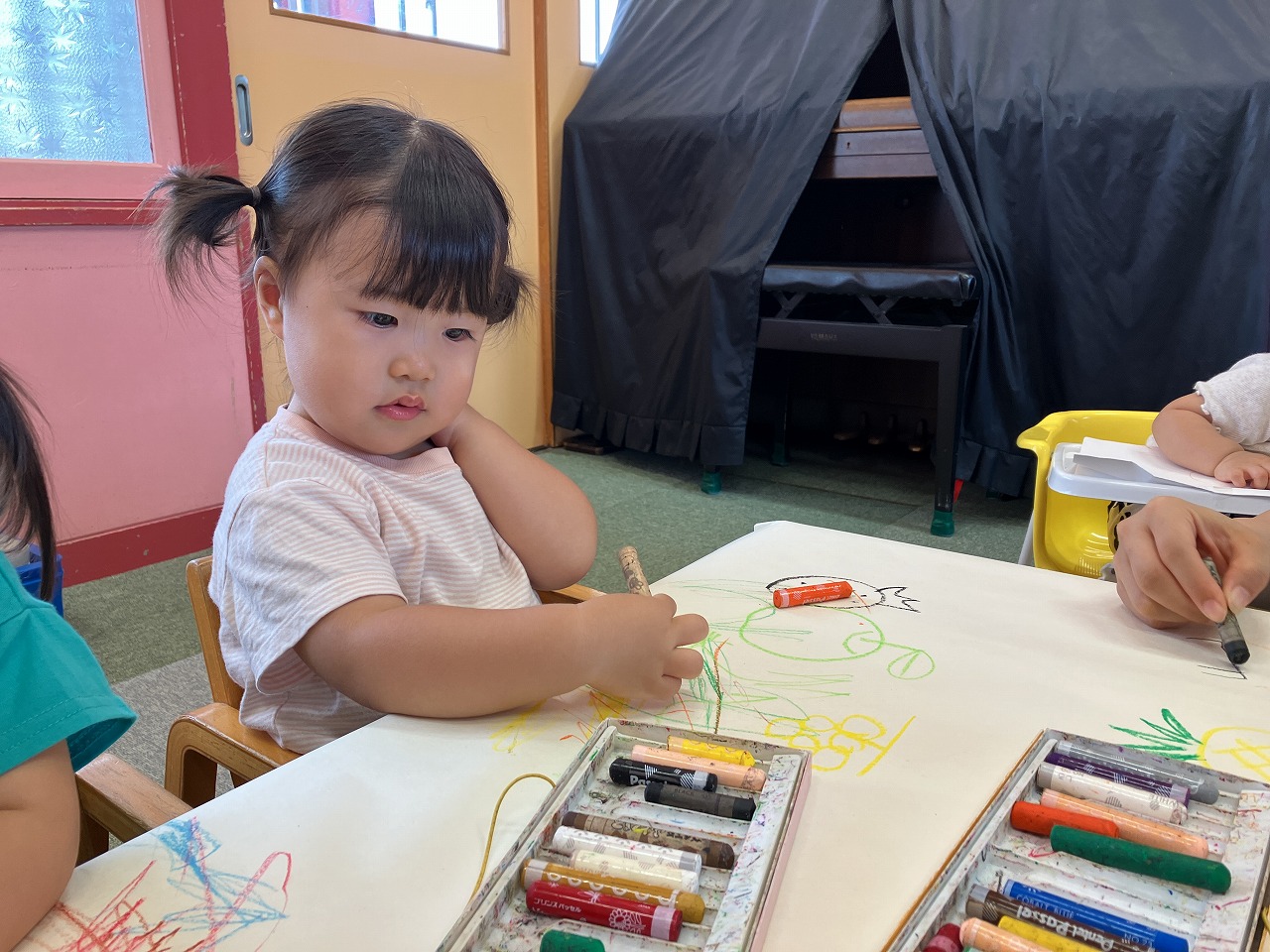 子どもたちの大好きな活動の一つのお絵描きをしました。自分の好きな色を用いて殴り描きをする姿、先生に絵を描いて欲しい!とお願いする姿などお絵描き一つでも様々な様子が見られます。最近は色の名前も言える子が増えてきて「○○色」「これは〇色」などと会話をしながら楽しんでいる姿がたくさん見られるようになりました。またみんなで楽しくお絵描きをしようね!