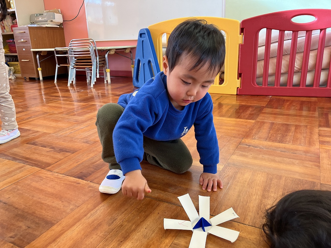 紙コップを使ってコマを作って遊んでいきましたよ!自分たちで紙コップにお絵描きをして作りました。いつもの平面の紙に描くのではなかったので苦戦しながら描いている子もいましたが描いている姿はとても集中していました。いざ出来たコマを使って回していったのですが最初は中々上手く回らない子もいましたが、何度も繰り返しやっていくことで回るようになると嬉しそうに手を叩いて喜んでいましたよ!