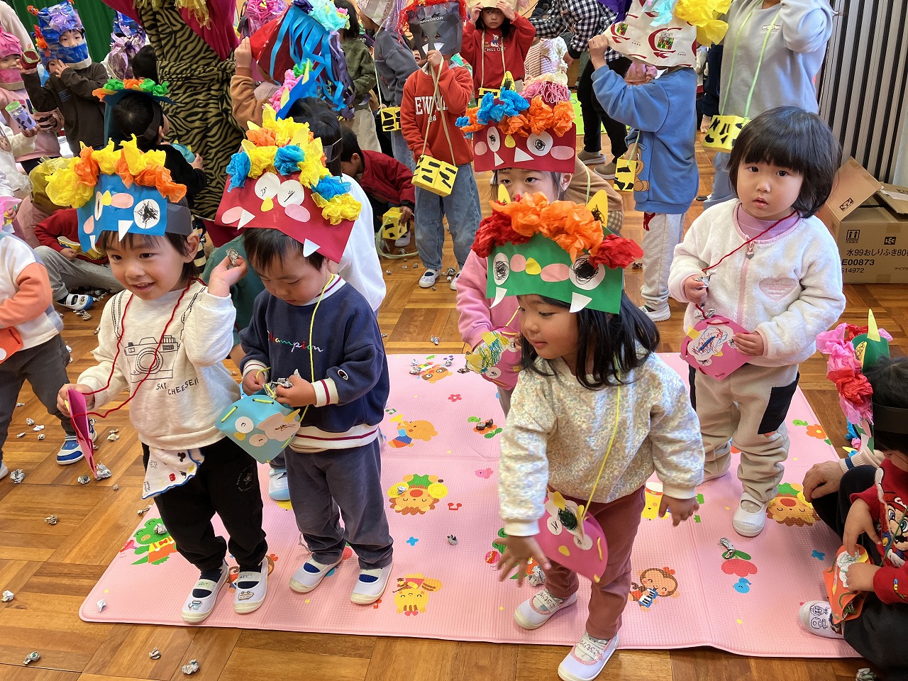 3日には節分の会がありました。自分たちで作ったお面やますを作って持って行き遊戯室に行きました!色々な楽しい事をやったあとにはステージから鬼が登場。最初はこわばった表情をしていた子ども達ですが優しい鬼だと分かると頑張って「鬼はそと・福はうち!」と言いながら豆を投げる事が出来ました!みんなの中にいる鬼はやっつけることが出来たかな?