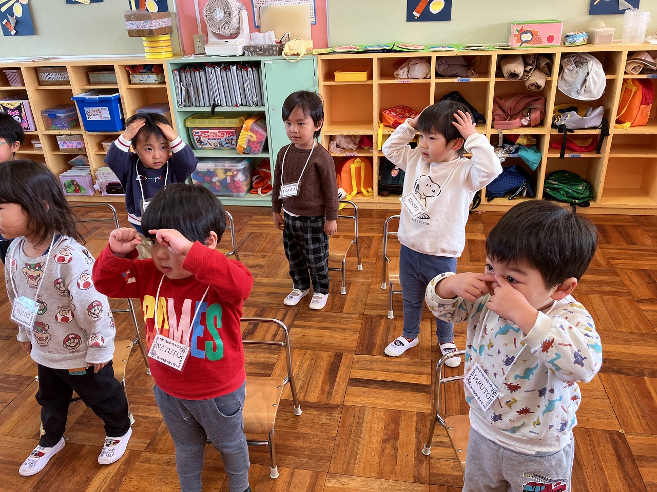 毎日朝のシール貼りをした後には子ども達と一緒に体操を何曲かやっていますよ!色々な曲をやっている中で子ども達の中でもお気に入りの曲が何曲かあるようで「何がやりたい?」と聞くとリクエストをしてくれることが多く、中でも「親子でメリーゴーランド」が大好きでよくリクエストしてくれています♪友だちや保育者と一緒に手を繋いで丸を作ってみたり、二人組になってやってみたりと色々なバージョンをしながら楽しんでいます!