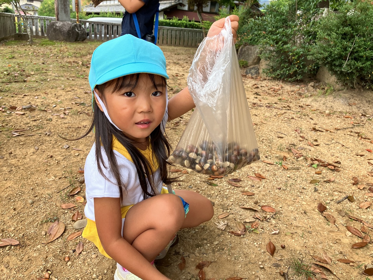 長かった夏も終わり、やっと秋がきました。お散歩に出かけるとどんぐりがたくさん落ちていました。少し前に行ったときは緑色だったどんぐりも茶色になっていて、子ども達もその変化に気が付き、大発見のように報告してくれました。そして中から虫が出てくることも知っており、次の日部屋にどんぐりから出た虫がいて、みんなで観察しました。「どんぐりの中が好きなんだね」と話しかけたあとはそっと逃がしてあげていました。