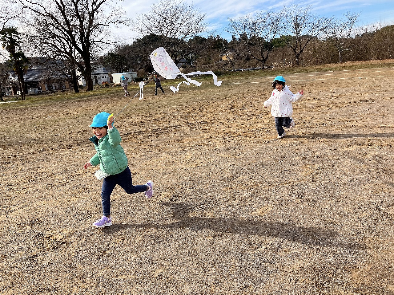 凧に好きな絵を描いて外で飛ばしました。一日目は風が少なく、たくさん走ってやっと高く揚げることができましたが、二日目は風が強かったので、走らなくても高く揚がることに驚きを隠せず、嬉しそうな子どもたちでした。糸のコントロールが難しい様子でしたが、時間が経つにつれてコツをつかみ、友達と教えあっている姿が微笑ましかったです。