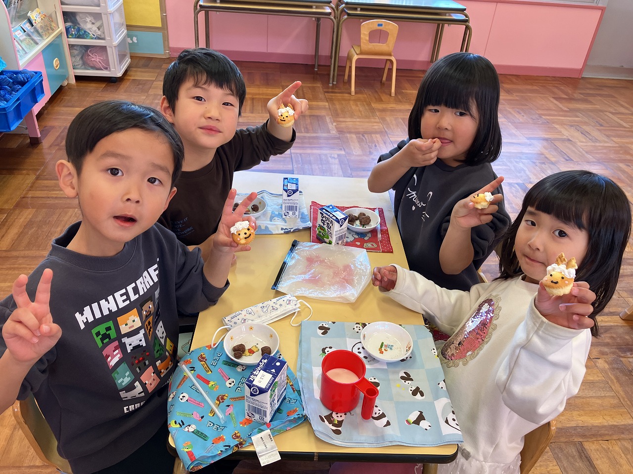節分の会がありました。鬼が来てみんなで元気に豆まきをすることができ、その日のおやつがカップケーキと豆(麩で作ったもの)で、子どもたちは大喜び。また「おにはーそと!」と撒く真似をしながら友達と楽しくおいしく食べることができました。「鬼を食べる」といいながら少しずつ食べていく姿が可愛かったです。