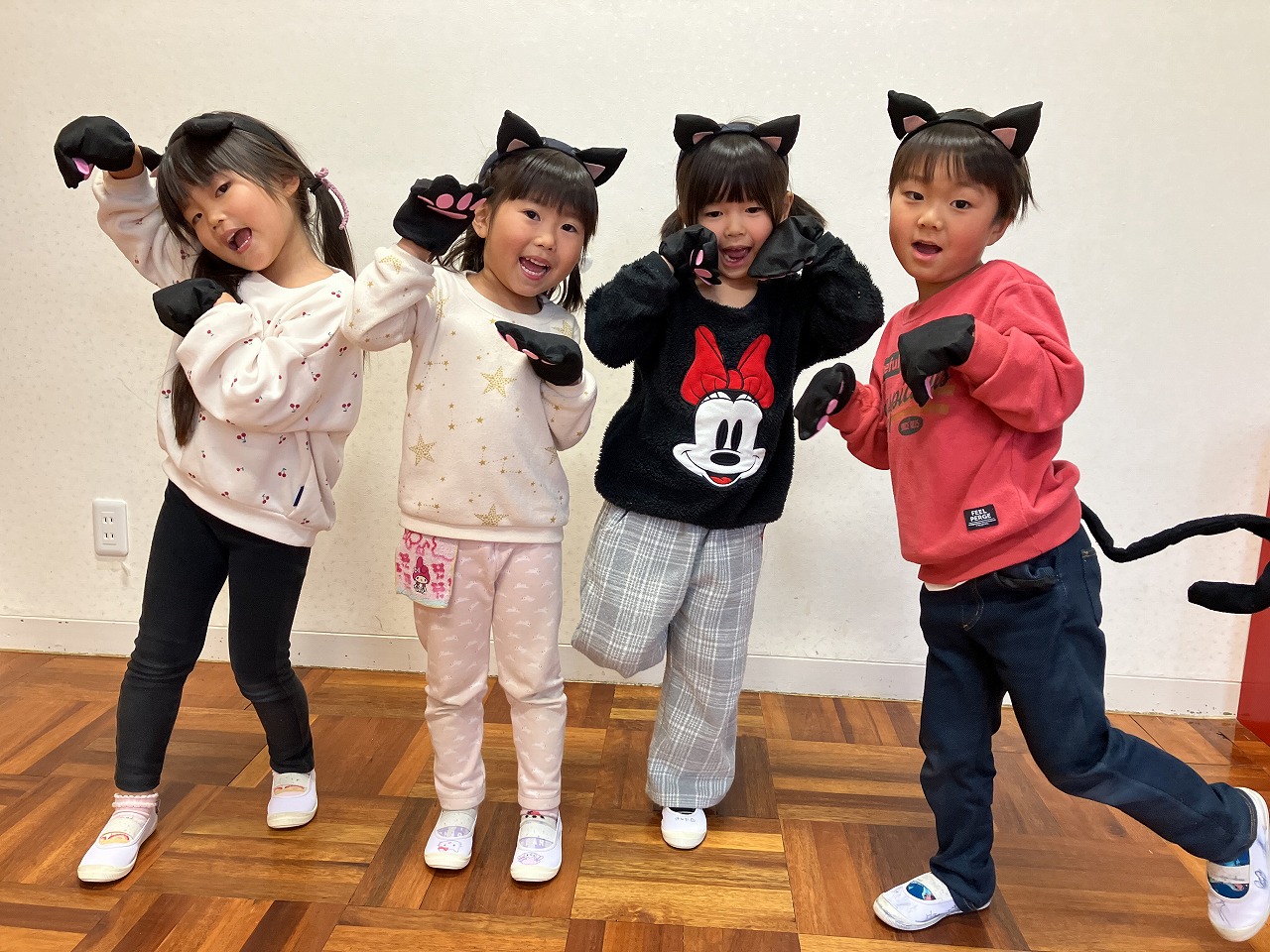 ねこの耳、しっぽ、肉球をつけてねこになりきりました。可愛い黒猫がいっぱいになり、「にゃーにゃー」と賑やかでした。ねこのダンスを踊ったりちょっとした劇のようなことをして遊んだりして、そら組さんみんなで楽しむことができました。なりきりが得意な子どもたちは次何になろうかと張り切っています。