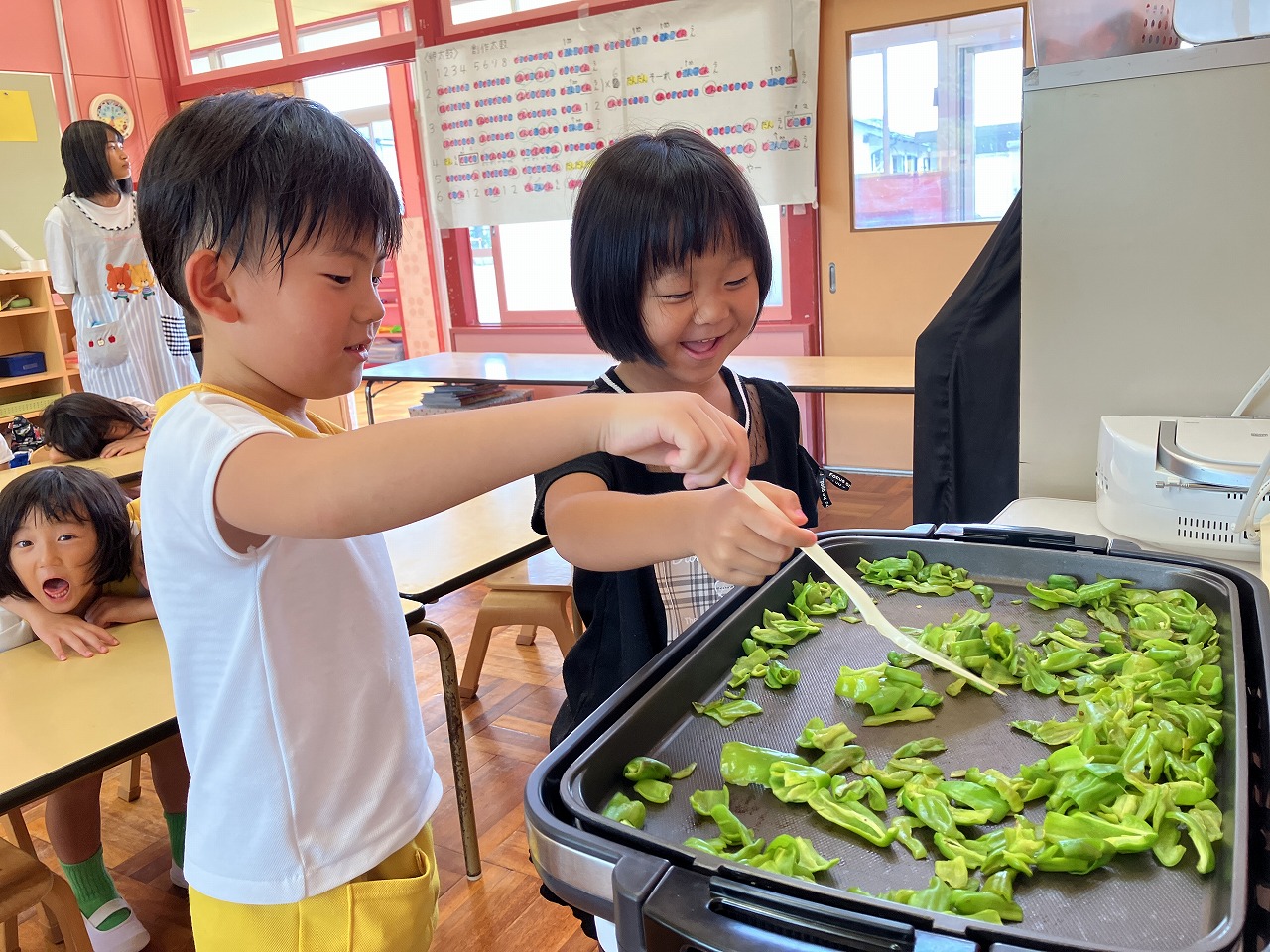 たいよう組の育てているピーマンは、まだまだ元気です。今日もたくさん収穫できたので、自分たちでちぎって種を取り、ホットプレートで焼いて食べました。たくさん収穫できたので、ちぎってもちぎってもなくならないので、「いつまでやるんだーー。」と言っている子も・・・ホットプレートで炒めるときには、「お母さんみたい。」と言ってとても嬉しそうでした。ピーマンが苦手な子も、自分たちで収穫して、調理をしたからなのか「おいしいね。」と、食べる事が出来ました!このような経験を通して、子どもたちの食に対する意識が変わっていくといいなと思います。