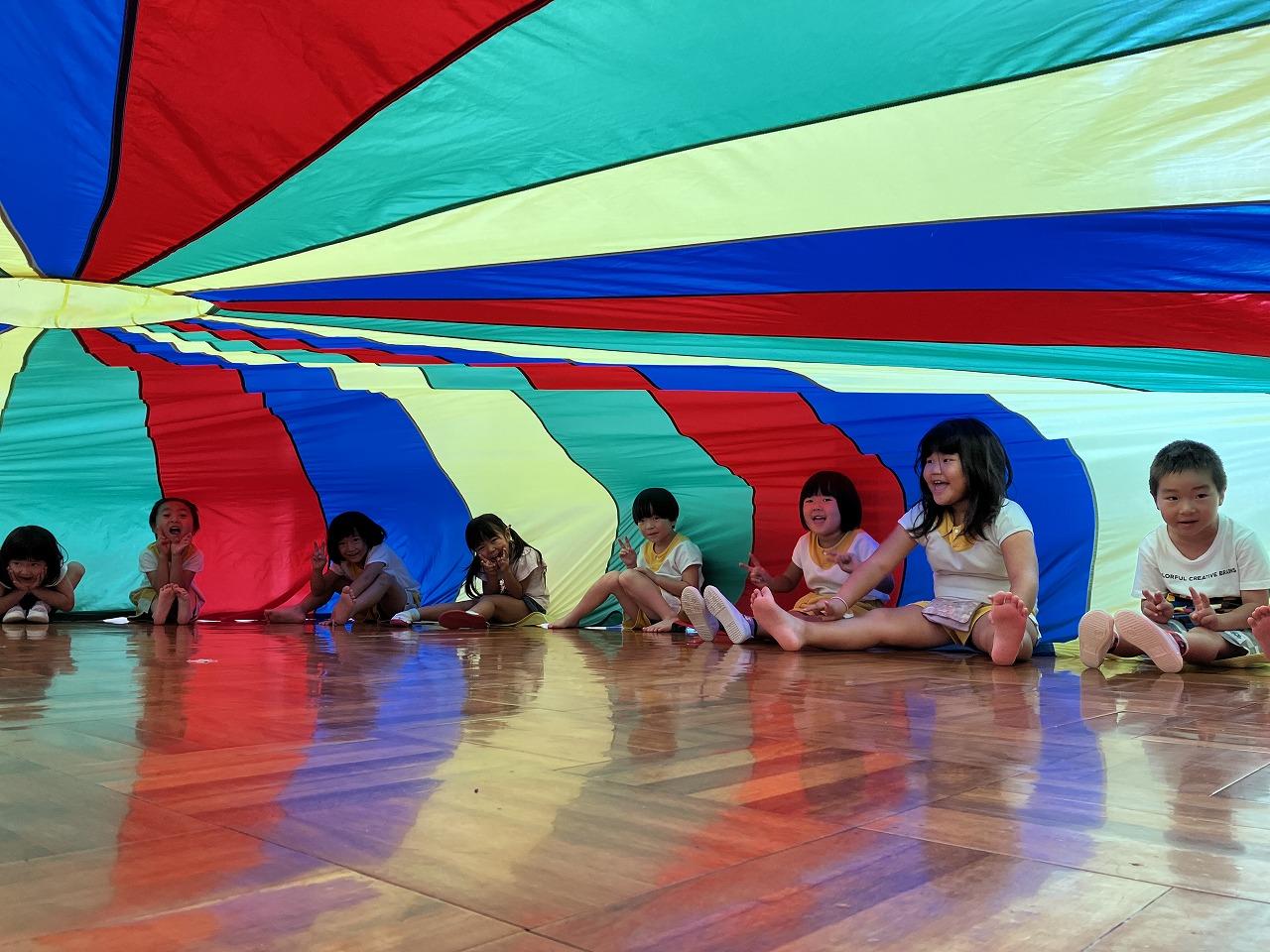 運動会で、年長児はバルーンを遊戯で行います。重くて大変で、振付けを覚えることも難しいですが、クライマックスにボールがポーンと飛ぶところを見ると、大満足な表情!!みんなで協力して何かを頑張る姿やそれぞれの目標を持って取り組む姿がとても格好いいですね。